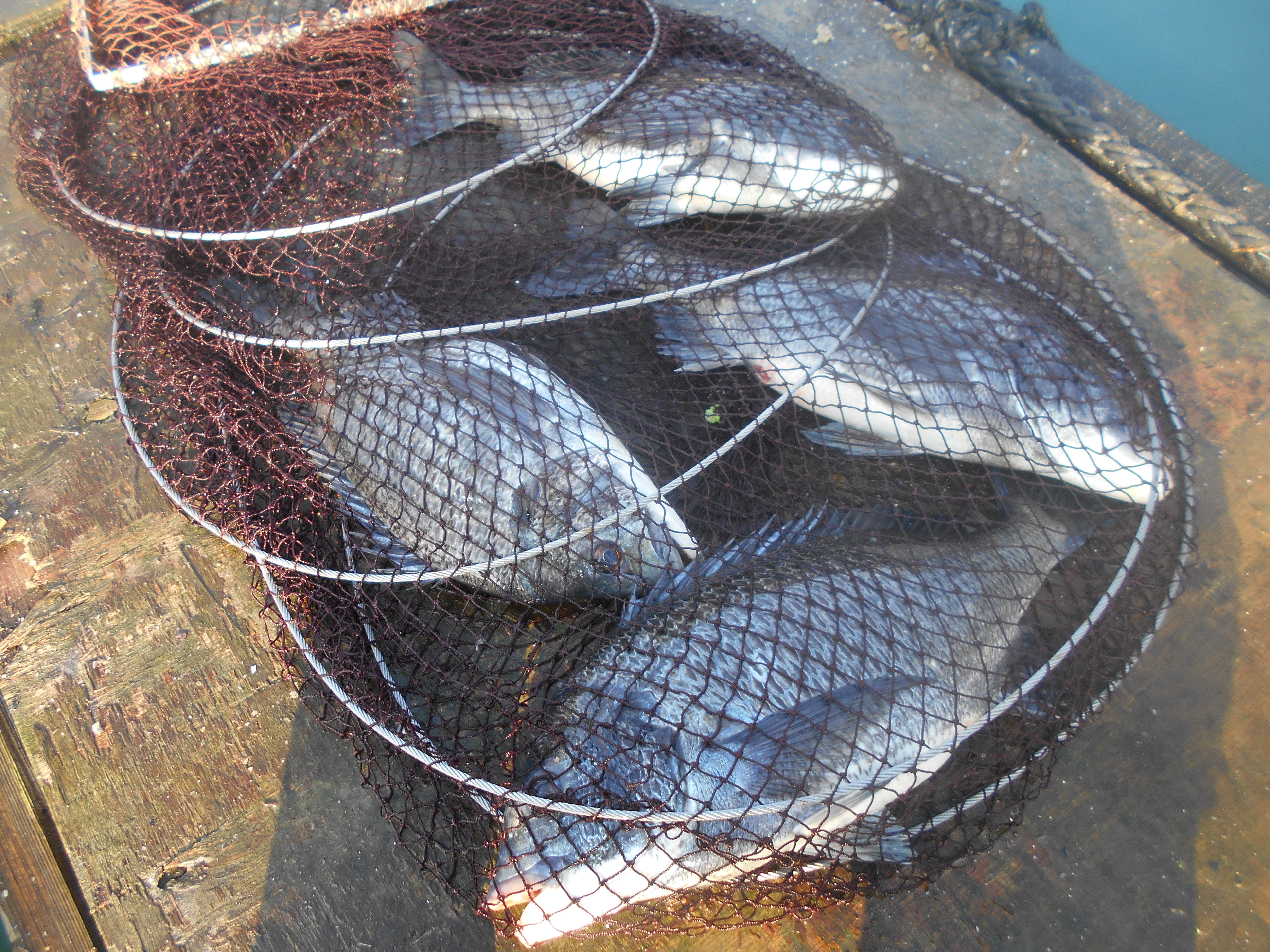 3枚目を釣り上げて、ごちゃごちゃしている間に漁師さんが筏に帰ってこられた。近くに投げればチヌがいることがわかったが、船があるのでまた離れた位置しか狙えなくなった。3枚目が釣れて30分後の13時20分、アタリがでた。アタリ方はこれまでの3枚とは違い、突っつくアタリだった。強い突っつきアタリがコン、コン。コンとあり、引き込むアタリの前に餌が切れると考え、4度目のコンであわせた。かかったのはチヌだった。このチヌは3枚目より引きは強かったので、年なしを期待した。バレそうな気はしたが、徐々に上がってきて、最後は少しバタバタしたが、無事すくった。残念ながら年なしではなかったが、よい型だった。